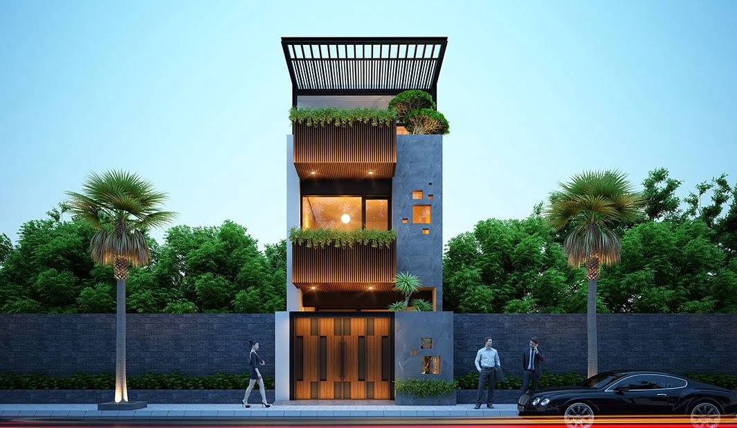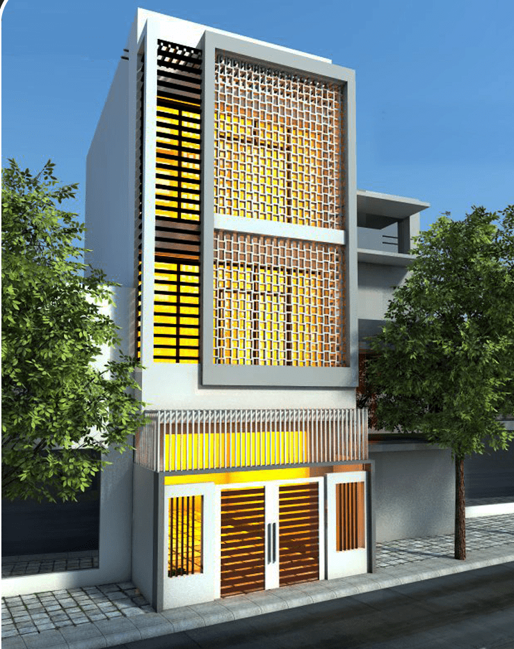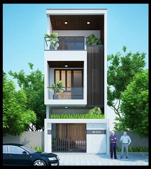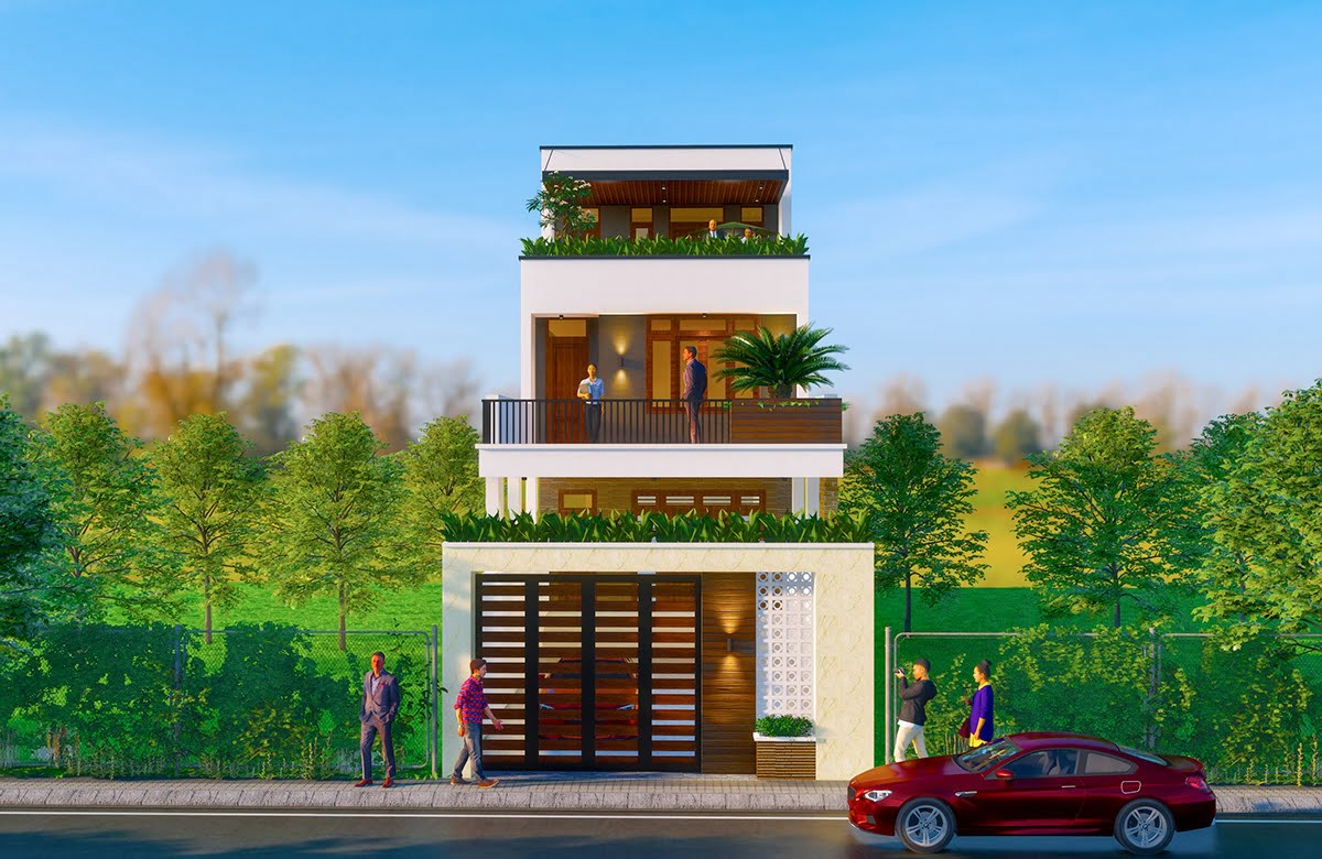Phối cảnh kiến trúc mẫu nhà ống đơn giản, phần mặt tiền nhô ra phía trước được che chắn bởi các loại cột chịu lực và trang trí. Khối ban công tầng 2 trong nhà phố 3 tầng được đua rộng hơn so với các tầng khác, tận dụng trồng tiểu cảnh xanh, giúp cân chỉnh hình khối, đồng thời tạo hiệu ứng thẩm mĩ cũng như hiệu ứng không gian tốt hơn rất nhiều.