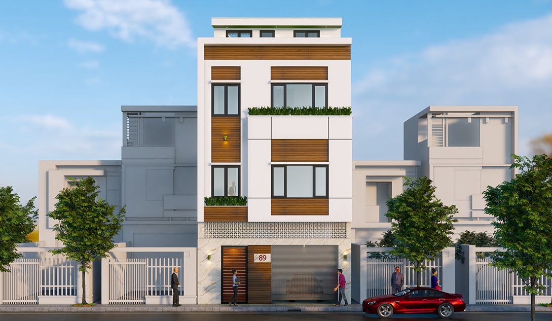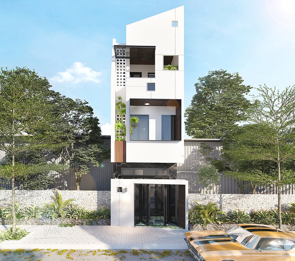 Thiết kế nhà phố 3 tầng mặt tiền 6m theo phong cách hiện đại, trẻ trung với gam màu trắng chủ đạo, điểm xuyến thêm các thanh nan gỗ giúp kiến trúc nhà phố thêm trang nhã và hài hòa.