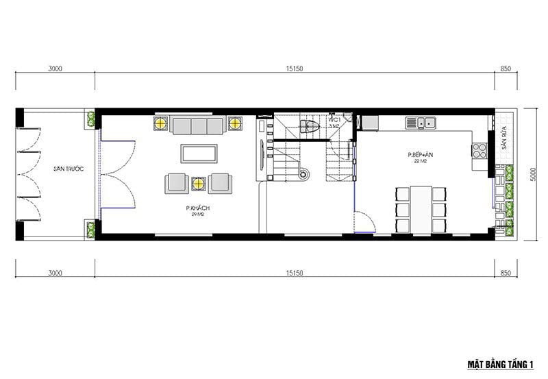 - Bếp và phòng ăn sẽ nằm trong cùng, có thể có cửa phụ thông ra sân sau.