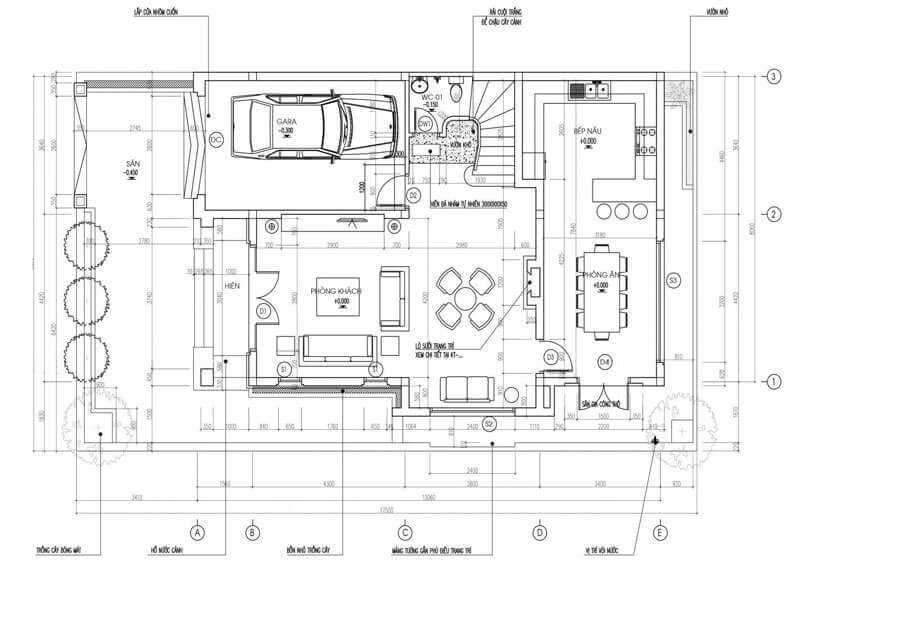 Tầng trệt gồm: Nhà xe, phòng khách, phòng ăn, nhà bếp