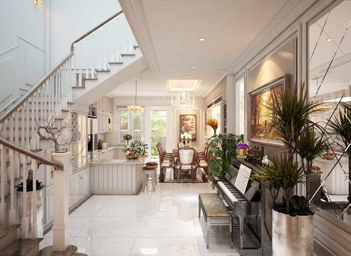Thiết kế mặt bằng nội thất tầng trệt nhà phố kiểu tân cổ điển