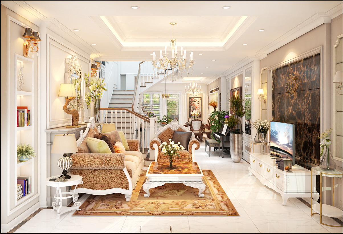 Thiết kế thi công nội thất tầng 1 nhà phố tân cổ điển tại Lào Cai sang trọng đẳng cấp