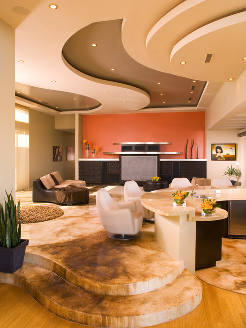 Nếu theo phong cách hiện đại thì trần thạch cao thường đơn giản hơn về độ chi tiết mà hướng về đường nét hơn. do vậy thường sẽ không bị chi phối bởi sự đối xứng. màu sắc cũng sáng hoặc nhiều màu sắc.