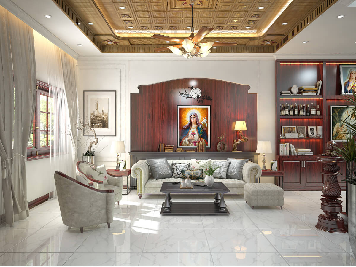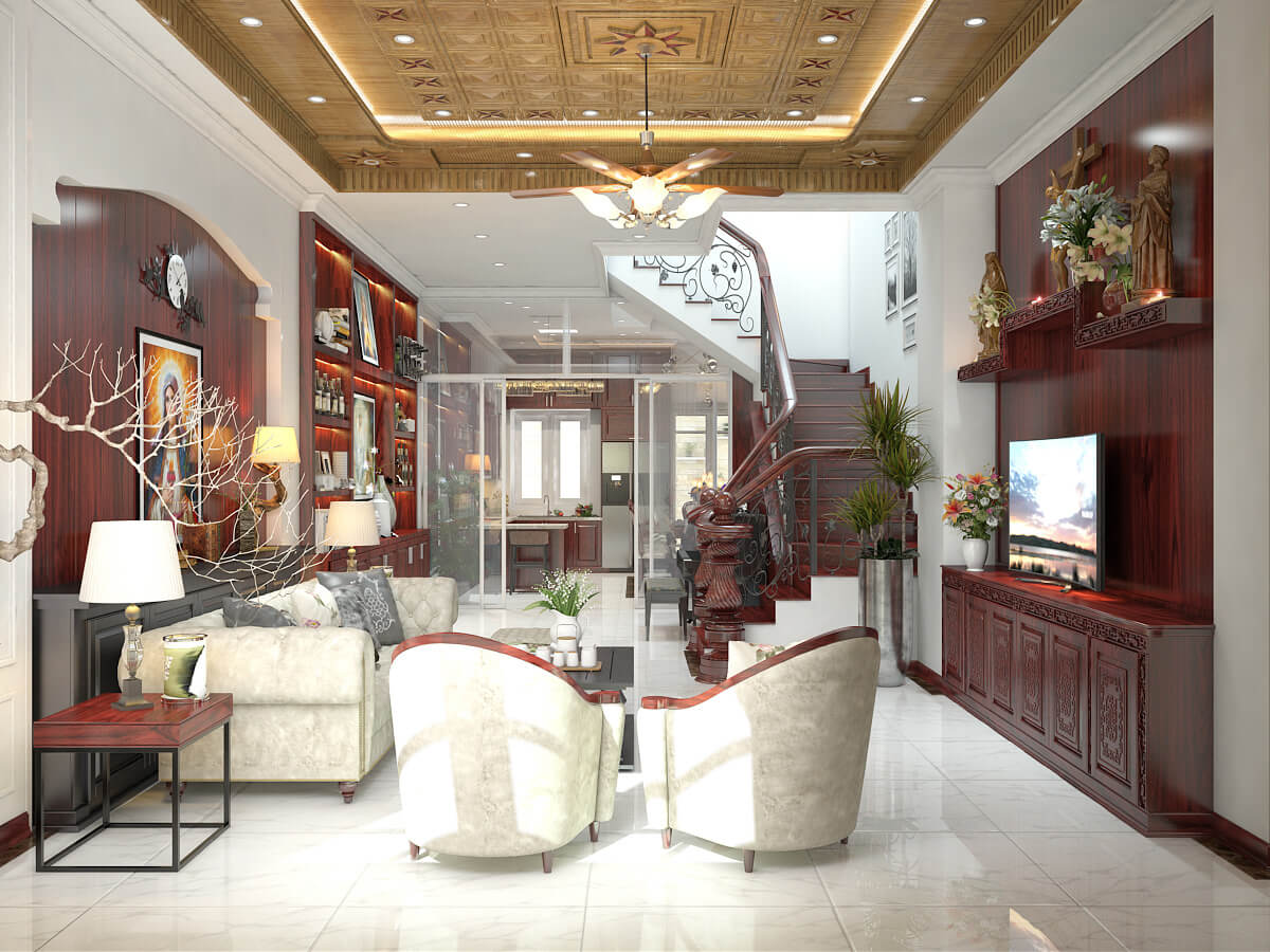 Trần phòng khách nhà phố ốp gỗ, chạm trổ tinh tế thể hiện đẳng cấp và gu thẫm mỹ cho gia chủ.