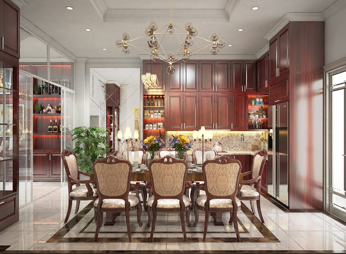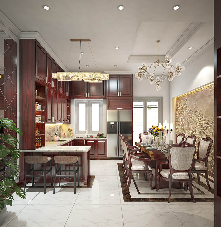 - Phía trong cùng là bếp nấu và bàn ăn. Khu vực bàn ăn rộng để chủ nhà mời bạn bè và người thân ở lại dùng bữa.