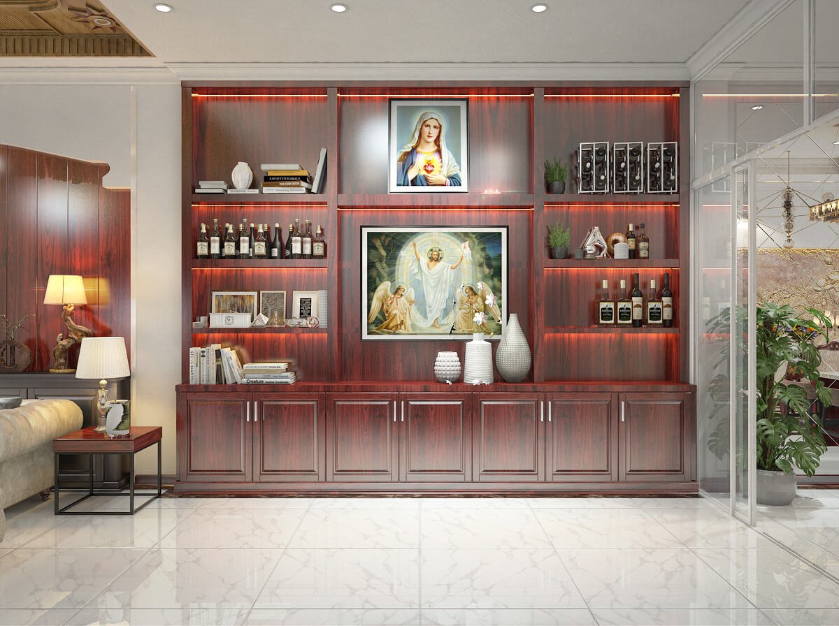 Thiết kế phòng khách sang trọng, với bộ bàn ghế sofa bọc nệm màu trắng giúp kéo dài thời gian trò chuyện giữa khách và chủ. Phía trên kệ tivi được chủ nhà tận dụng để đặt bàn thờ gia tiên, thể hiện niềm tôn kính của chủ nhà với ông bà.