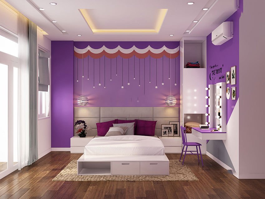 Phòng ngủ cô con gái út được trang trí bằng gam màu tím, thế giới của những cô công chúa được tái hiện rõ nét qua cách sắp xếp bàn ghế và màu sắc khiến bé vô cùng thích thú.