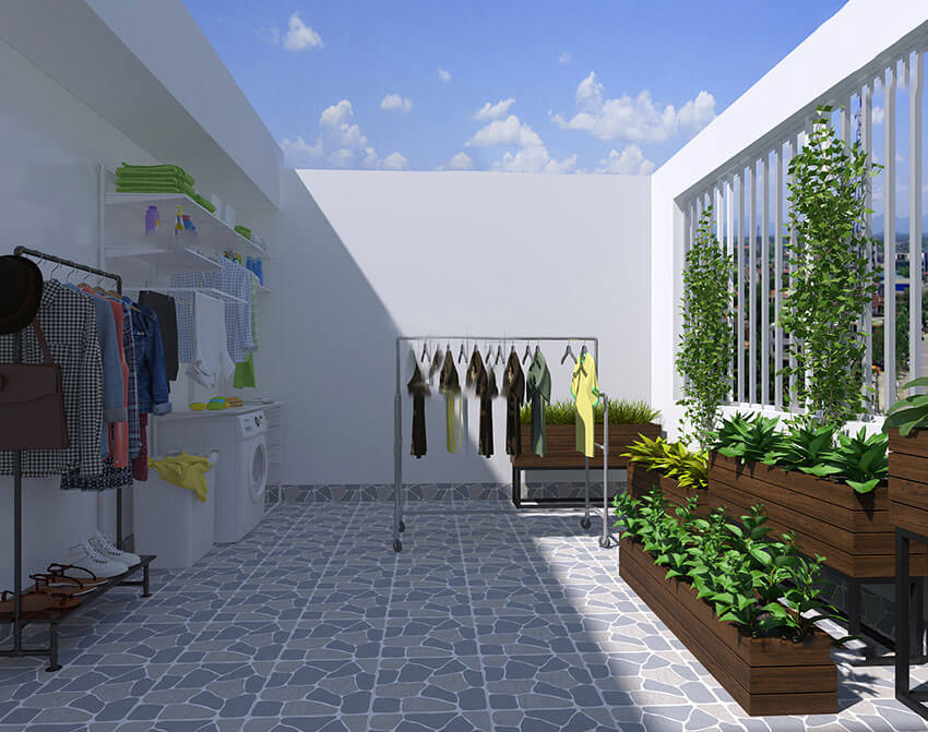 Khu vực giặt phơi đặt trên tầng 3 được xử lý đường ống dẫn và thoát nước khoa học, nhằm chống thấm cho các tầng bên dưới.