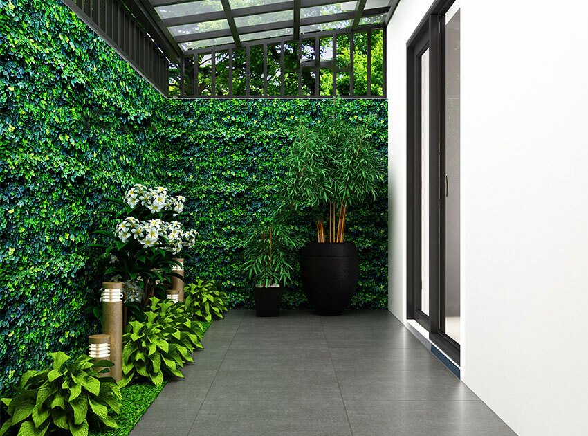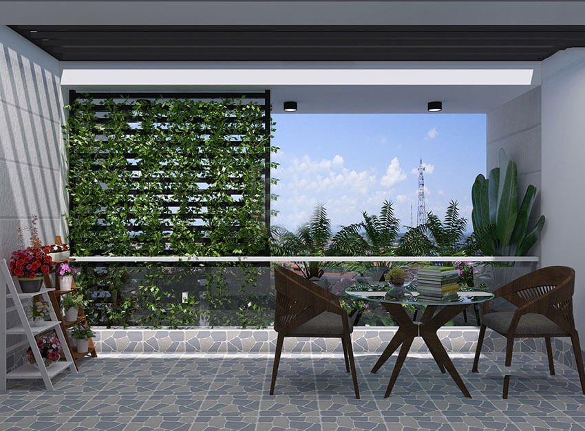 Để tránh nắng chiếu trực tiếp từ hướng Tây kiến trúc sư đã xây một bức tường cao bằng đá, so với nhà hàng xóm, cây xanh bố trí xen kẽ trên các tầng cũng nằm trong sự tính toán của kiến trúc sư nhằm tạo thành lớp lọc không khí để tránh tiếng ồn và bụi làm ảnh hưởng đến cuộc sống các thành viên trong gia đình.
