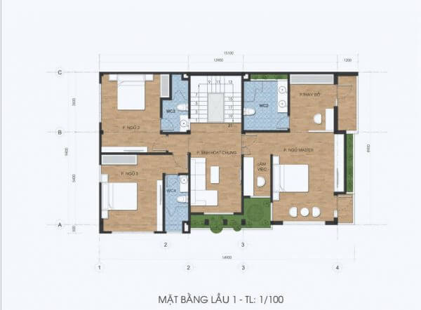 Lầu 1 gồm: Phòng sinh hoạt chung, phòng ngủ master, phòng ngủ 2, phòng ngủ 3