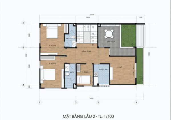 Lầu 2 gồm: Sân thượng, phòng thờ, phòng giặt phơi, phòng ngủ 4, phòng ngủ 5, phòng ngủ 6