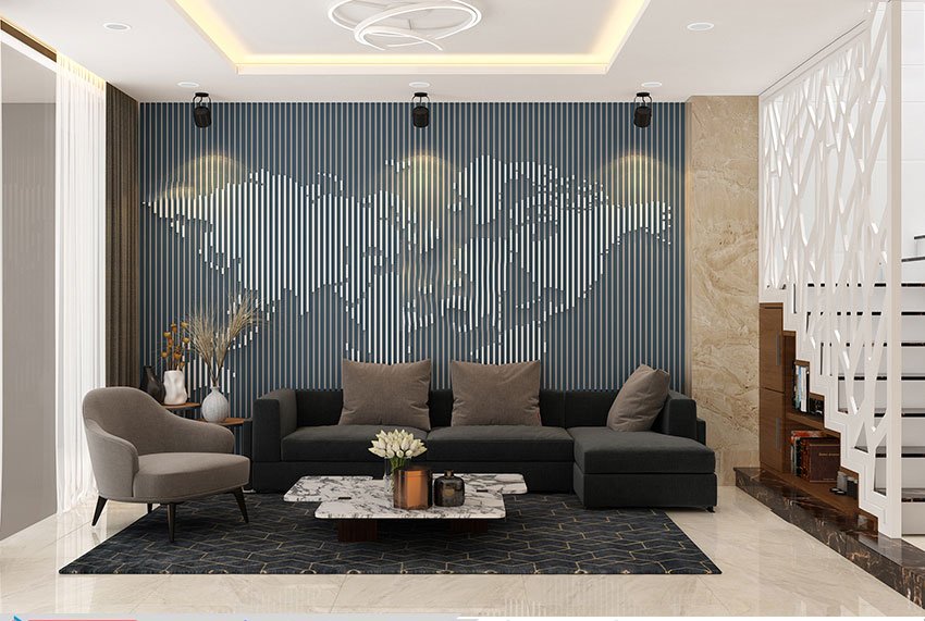 Trong phòng khách một bức tường hình bản đồ thế giới làm bằng gỗ cách điệu mang đến sự khác biệt cho căn phòng, khiến khách đến chơi nhà nhớ mãi không quên.
