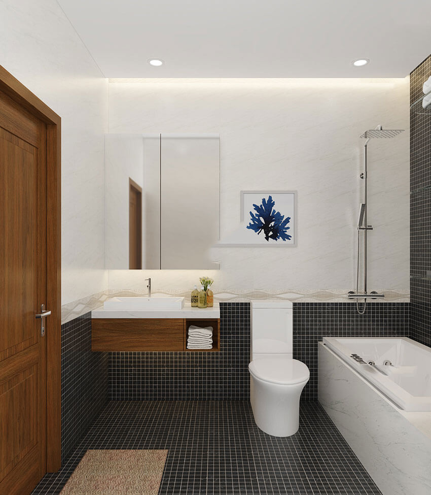 Hai phòng ngủ 4 và 5 thường xuyên có người ở nên thiết kế nhà vệ sinh riêng. Riêng phòng ngủ 6 dành cho khách thỉnh thoảng ở lại nên sẽ sử dụng chung nhà vệ sinh với phòng ngủ 5.