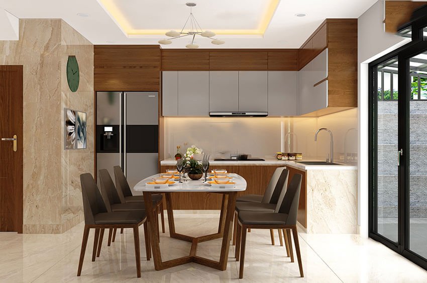 Vì gia đình có đông thành viên nên kiến trúc sư chọn một chiếc bàn ăn dài, có thể đặt được nhiều ghế ăn xung quanh, ngoài ra bàn cũng có thể mở rộng mỗi khi nhà tổ chức những bữa tiệc đông người cuối tuần, hoặc khi có khách đến chơi.