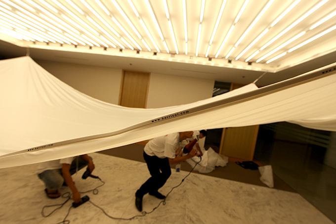 - Khi lắp đặt tại địa điểm, tấm màng sẽ được làm nóng lên (tới 40ºC sử dụng các quạt sưởi) và căng lên bằng các dụng cụ chuyên dụng và móc vào hệ thống xương khung viền đã được lắp đặt trước đó.